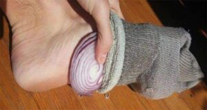 Lo único que debes hacer es partir una cebolla blanca o morada en rodajas y ponerla en el arco de tus pies, usando calcetines o una agujeta, no tan justa para evitar problemas de circulación.